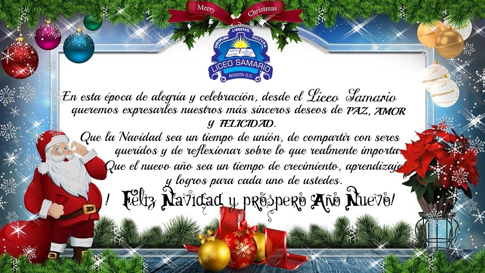 Las Directivas del Liceo Samario desean a todos los padres de familia y a la comunidad educativa en general sus más sinceros deseos de una Feliz Navidad. Que en esta época tan especial la alegría, la unión y el amor reinen en cada uno de sus hogares. De igual forma les deseamos un próspero y bendecido Año 2026, colmado de salud, paz, bienestar y felicidad. Agradecemos su confianza y acompañamiento permanente en la formación de nuestros estudiantes.